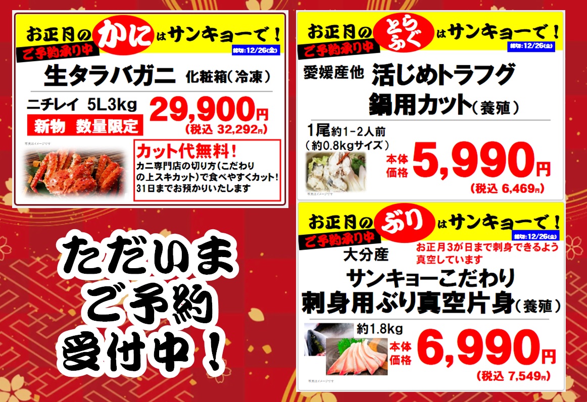 ただいま年末用たらばがに・ふぐ・ぶりブロックご予約受付中!